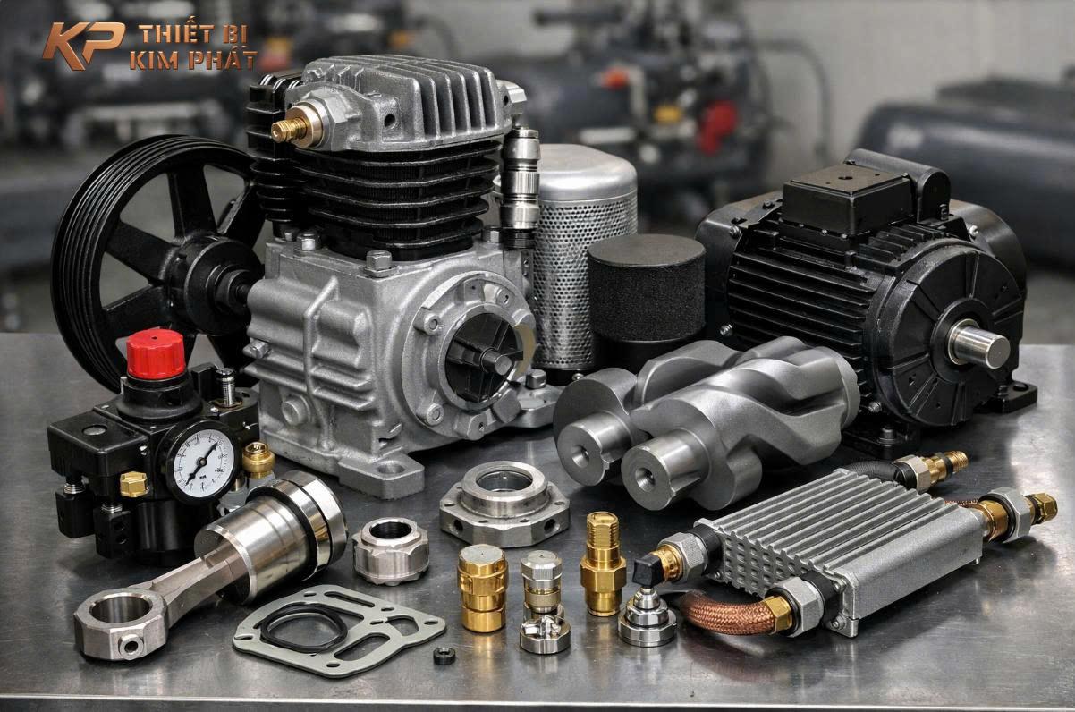 Dù bạn đang sở hữu một chiếc máy nén khí Piston “nồi đồng cối đá” hay một hệ thống máy nén khí trục vít hiện đại, sau một thời gian dài hoạt động, việc hao mòn linh kiện là điều không thể tránh khỏi. Để máy luôn hoạt động với hiệu suất tối đa và không làm gián đoạn sản xuất, việc hiểu rõ và thay thế phụ tùng đúng lúc là vô cùng quan trọng. Hãy cùng Công ty Thiết bị Kim Phát tìm hiểu chi tiết về các loại linh kiện máy nén khí và kinh nghiệm mua sắm chuẩn xác nhất nhé!